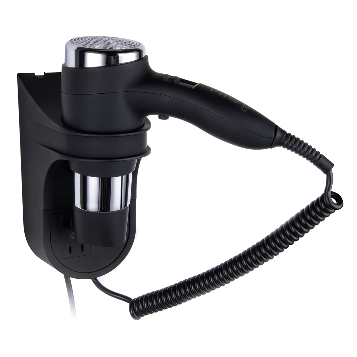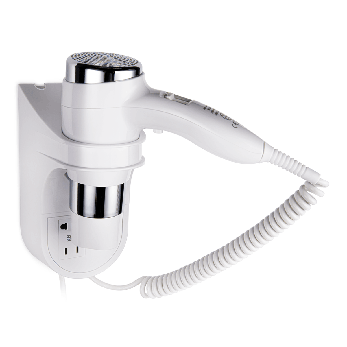 Dotato di pulsante a 2 velocità, regolatori per temperatura, potenza e flusso dell'aria, permette un'asciugatura personalizzata secondo le necessità dell'ospite. Un pulsante di spegnimento automatico garantisce la sicurezza, interrompendo immediatamente il funzionamento in caso di rilascio.