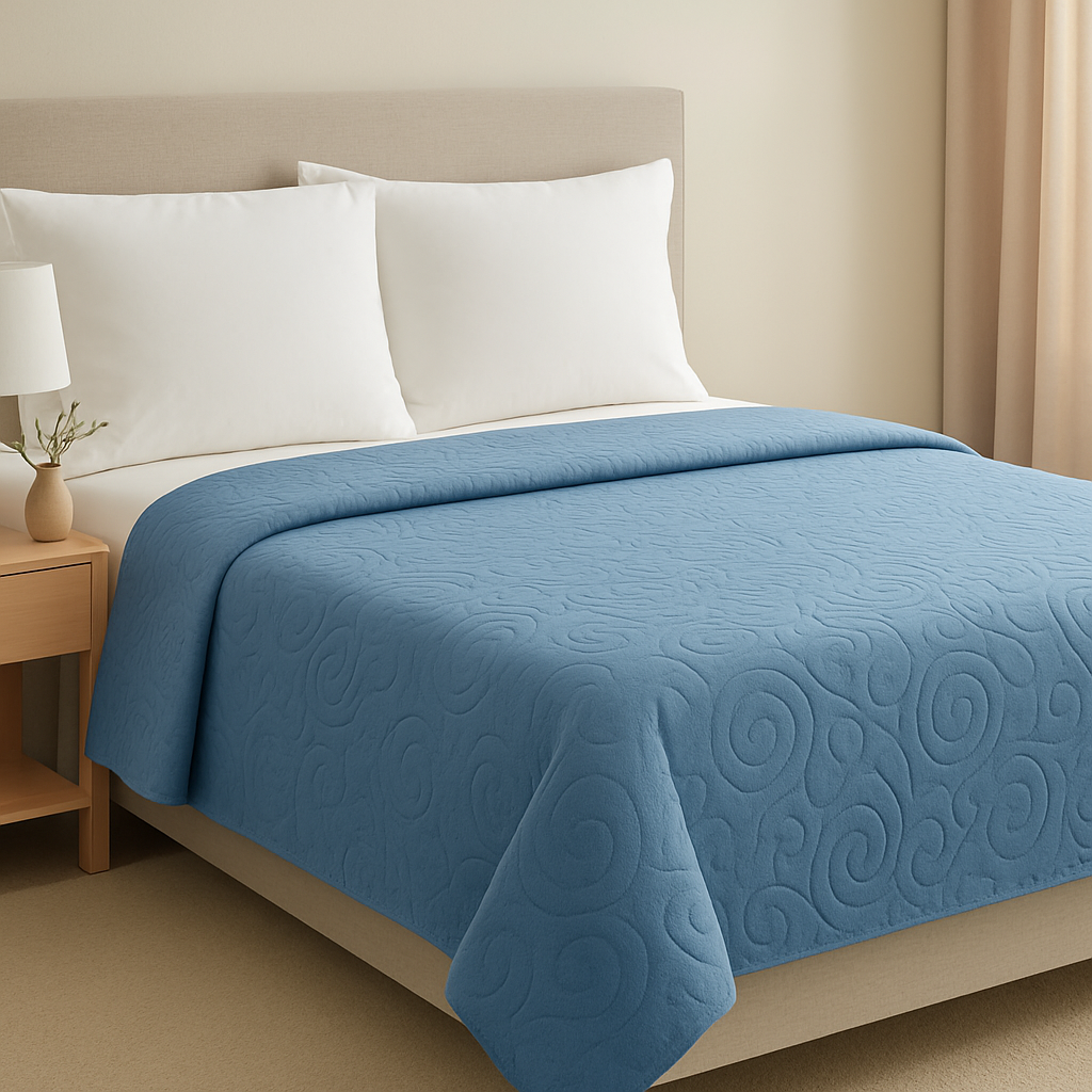 Il Copriletto Tiffany nella variante azzurra porta in camera un tocco di freschezza e luminosità, mantenendo lo stile elegante richiesto dalle migliori strutture ricettive. La trapuntatura decorativa con motivo ricamato continuo crea un effetto visivo raffinato, perfetto per valorizzare qualsiasi ambiente hotellerie.