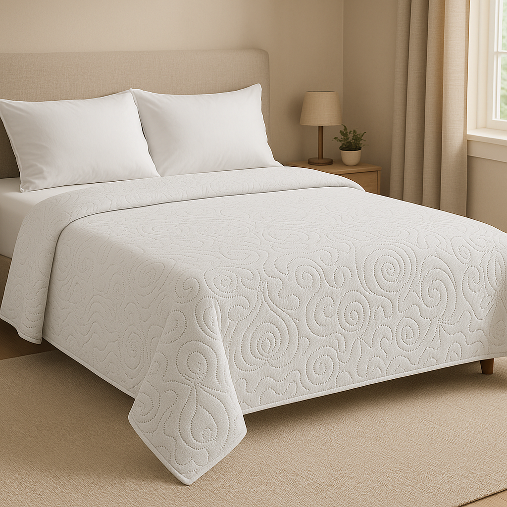 Il Copriletto Tiffany è pensato per strutture ricettive che desiderano un’immagine elegante e ordinata in camera, senza rinunciare alla praticità. La sua trapuntatura decorativa, realizzata con un motivo a ricamo continuo, dona un aspetto raffinato e armonioso al letto, valorizzando immediatamente l’ambiente.